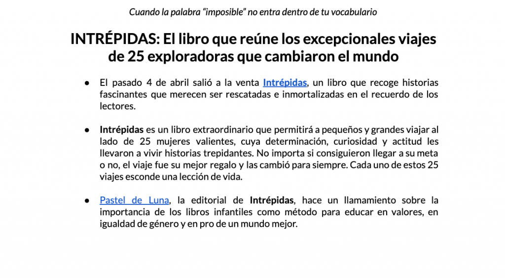 En este caso y aprovechando que el pasado jueves 2 de abril se celebró el Día Internacional del Libro Infantil hemos querido inaugurar esta sección con la campaña de prensa que realizamos entre marzo y mayo de 2018 para la editorial Pastel de Luna y su libro ilustrado, “Intrépidas: los excepcionales viajes de 25 exploradoras”.