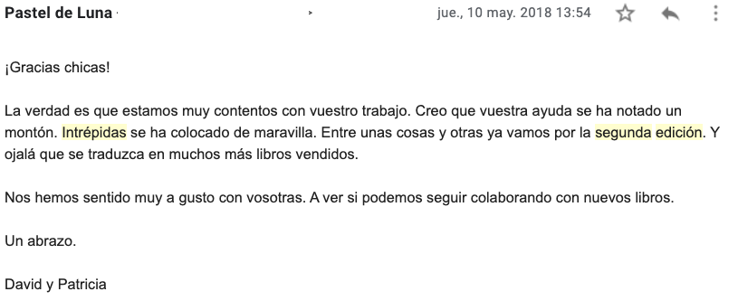 Para la editorial: “Contar con Eli Romero como agencia de comunicación para el lanzamiento de nuestro libro Intrépidas supuso un importante impulso no solo para el propio título, sino también para nuestro proyecto editorial. Realmente los resultados obtenidos superaron con creces nuestras expectativas. Intrépidas va ya por la quinta edición y nos ha ayudado a crecer como editorial y en parte se lo debemos al mimo con que trabajaron el libro desde la agencia de Eli romero.
